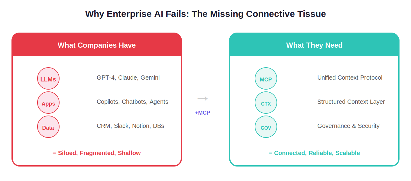 The vast majority of enterprise AI implementations are failing silently. Not because the models aren't powerful enough they are but because those models are operating in the dark. They can't access your CRM data in real time. They can't pull context from last Tuesday's Slack thread. They can't cross-reference your Notion roadmap with your support tickets. They are powerful brains floating in a void, disconnected from the very business context that would make them useful.