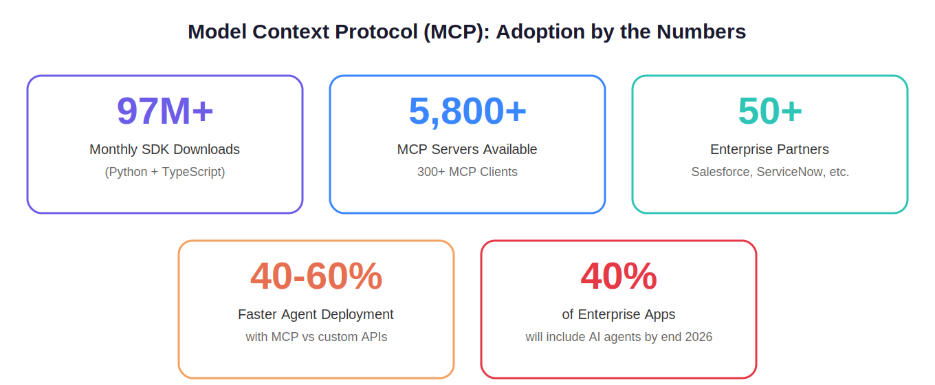The adoption has been extraordinary. Within a year, every major AI provider including OpenAI, Google DeepMind, and Microsoft adopted MCP. Monthly SDK downloads now exceed 97 million across Python and TypeScript. Over 5,800 MCP servers and 300 MCP clients are available in the ecosystem. More than 50 enterprise partners, including Salesforce, ServiceNow, and Workday, have committed to MCP implementation. In December 2025, Anthropic donated MCP to the Agentic AI Foundation under the Linux Foundation, with OpenAI and Block as co-founders, cementing its status as a vendor-neutral industry standard.
