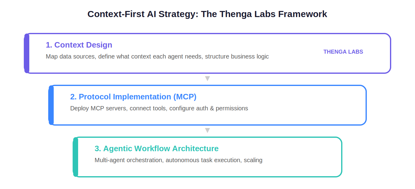 This is the layer Thenga Labs architects. We define and structure context before MCP implementation mapping data sources to agent needs, designing the semantic relationships between business systems, and building the governance framework that ensures every agent operates within clear boundaries. Without this layer, MCP is just an open pipe. With it, MCP becomes the foundation of a scalable, trustworthy agentic workflow architecture.
