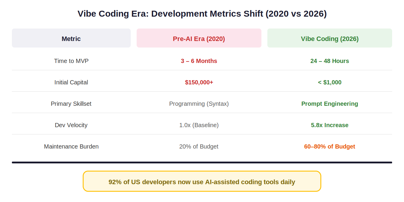 The most dramatic impact of vibe coding for founders is the total compression of the development cycle. What previously required a venture-backed team of six engineers and a six-month roadmap is now routinely accomplished by a single founder over a weekend. Platforms like Lovable and Bolt reportedly generate over 100,000 functional micro-apps per day. The initial capital required to reach MVP has plummeted from $150,000 or more to under $1,000, while development velocity has increased by 5.8x.