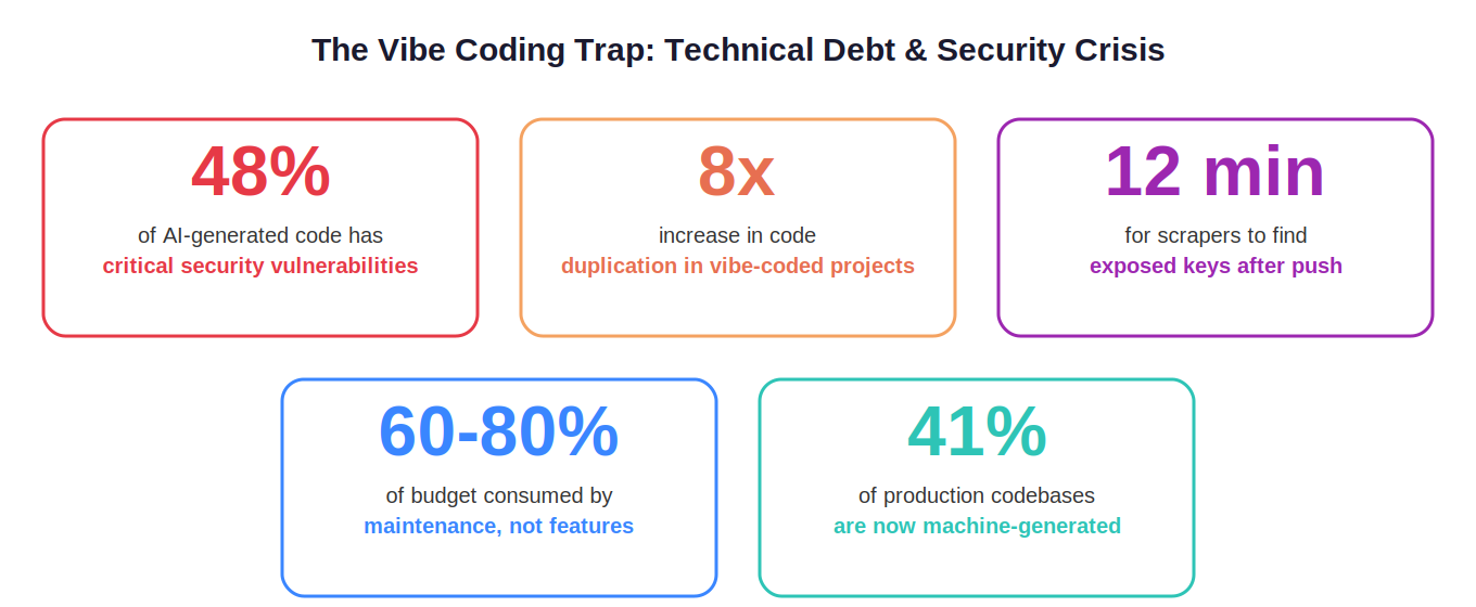 The real-world consequences are already here. In February 2026, the social network Moltbook suffered a catastrophic breach when its vibe-coded Supabase configuration exposed 1.5 million API keys and 35,000 user emails. The maintenance burden is equally punishing: vibe-coded startups now spend 60–80% of their budget on upkeep rather than new features, with security remediation costing 3x the standard rate and developer onboarding taking 40–60% longer.
