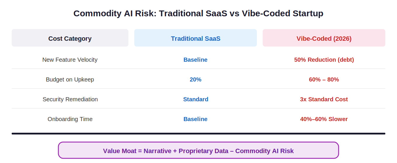 Beyond technical debt, vibe coding introduces commodity AI risk, the threat that your product's core value proposition can be replicated by a competitor or an internal IT team using general-purpose models at a fraction of the cost. The SaaSpocalypse of early 2026, which saw massive valuation de-ratings for companies like Salesforce and Atlassian, was driven by precisely this dynamic: agentic substitution, where customers replaced entire software seats with bespoke internal AI agents.