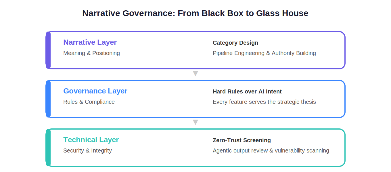 The governance model moves organizations from a black box of unreviewed AI code to a glass house of accountable, narrative-led systems. At the narrative layer, you define category design and pipeline engineering. At the governance layer, you enforce hard rules over AI intent. At the technical layer, you implement zero-trust screening of all agentic outputs.